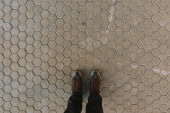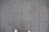 Człowiek stojący na powierzchni posadzki betonowej, stopy z góry