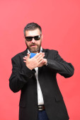 brodaty mężczyzna trzymający perfumy z poważną twarzą