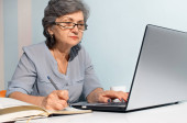 Zdjęcie "Starsza kobieta pisząca na laptopie " może być wykorzystywane do celów osobistych i komercyjnych zgodnie z warunkami zakupionej licencji Royalty-free. Obraz jest dostępny do pobrania w jakości wysokiej rozdzielczości do 5760x3840.