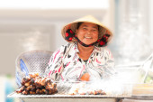 uśmiechnięty sprzedawca owoców w hoi rynku, Wietnam.