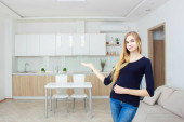 piękna młoda kobieta trzyma kieliszek z wodą w kuchni.
