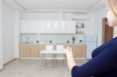 Zdjęcie "Agent nieruchomości prezentacji nowoczesny dom do klienta, Kobieta pokazuje kuchni." może być wykorzystywane do celów osobistych i komercyjnych zgodnie z warunkami zakupionej licencji Royalty-free. Obraz jest dostępny do pobrania w jakości wysokiej rozdzielczości do 5760x3840.