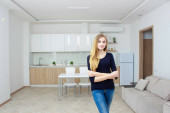 Agent nieruchomości prezentacji nowoczesny dom do klienta, Kobieta pokazuje kuchni.