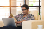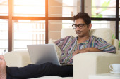 Człowiek za pomocą komputera na kanapie