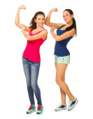 na białym tle dwóch dziewczyn fitness z hantlami na biały backgrou