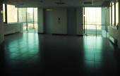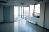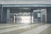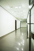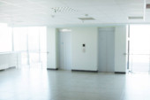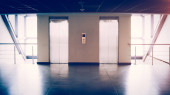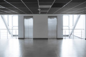 Szklane ściany z dwie windy w budynku biurowym, jest puste miejsce na tekst