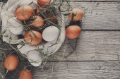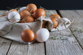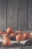 Świeży kurczak brązowy jaja na pojęcie stylu rustykalnym drewna rolnictwa ekologicznego