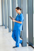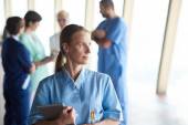 pięknych młodych kobiet stażysta medycznych patrząc pod oknem