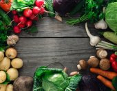 Zbiór różnych świeżych warzyw na drewnianym stole z granicy