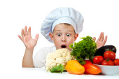 szef kuchni cute chłopiec z kalafiora i papryka. na białym tle