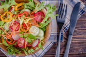 Zdjęcie "Sałatka z świeżych pomidorów, ogórków, cebuli i sałata, ubrany z oliwy z oliwek i pieprz w misce drewniane. Widok z góry" może być wykorzystywane do celów osobistych i komercyjnych zgodnie z warunkami zakupionej licencji Royalty-free. Obraz jest dostępny do pobrania w jakości wysokiej rozdzielczości do 5760x3840.