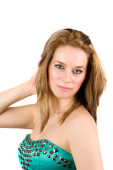 Rosjanki, śmiejąc się z kwiatem w długie włosy na białym tle