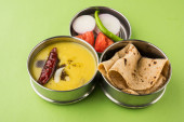 Zapisz Pobierz Podgląd indian typowe ze stali nierdzewnej Pojemnik lub tiffin z north indian lub menu żywności jak chapati / / roti, dal tadka, biały ryż i aloo / sabji ziemniaków / sabji gobi lub kalafior z sałatką