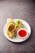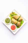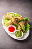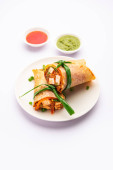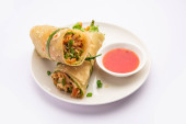 Indyjski popularne przekąski żywności o nazwie sajgonki warzywne lub veg roll lub veg franky wykonane przy użyciu paneer lub serem i warzywami wlana paratha/chapati/roti z ketchupu