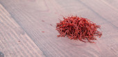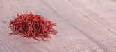 znamiona szafranu w drewnianą łyżką na drewniane tło zbliżenie