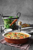 colorful composition of delicious pizza, vegetables and spices on blue wooden background close-up