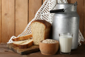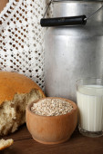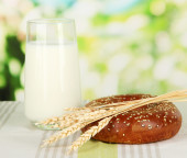 słoik mleka, smaczne bułeczki i spikelets na drewnianym stole, na brązowym tle