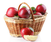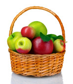 soczyste jabłka z zielonych liści w koszyku, na białym tle