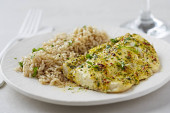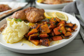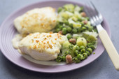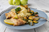 Piersi kurczaka z purée ziemniaczane, marchew, farsz i sos