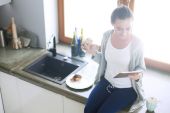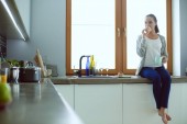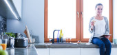 Młoda kobieta z sokiem pomarańczowym i tabletką w kuchni
