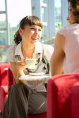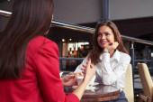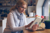 Śmiejąc się biznes kobieta czytania Aktualności na tablecie