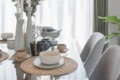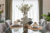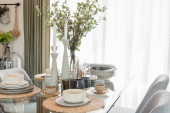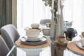 Zdjęcie "zestaw stół szkło z tabeli w nowoczesnej jadalni" może być wykorzystywane do celów osobistych i komercyjnych zgodnie z warunkami zakupionej licencji Royalty-free. Obraz jest dostępny do pobrania w jakości wysokiej rozdzielczości do 5760x3840.