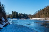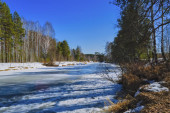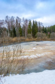 Piękną wiosnę krajobraz z małego jeziora skute lodem.