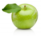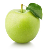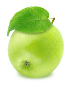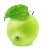 świeże zielone jabłko z liściem odizolowanym na białym tle