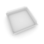 Pusty pojemnik z przezroczystą pokrywą, żywność, wyroby cukiernicze i inne produkty. Na białym tle