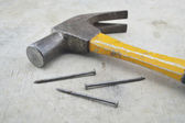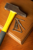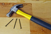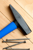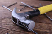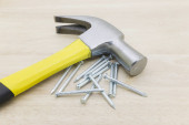 młotek, gwoździe leżą na drewnianym stołem