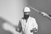 karate Brodaty mężczyzna w kimono, kask z kijem, piłka