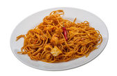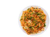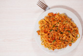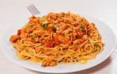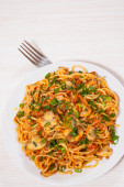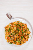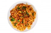 Capellini makaron z sosem pomidorowym i mięsem. Widok z góry. na białym tle