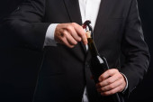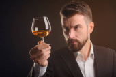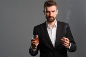 Popijając koniak i konieczności cygaro. Solidny wygląd młodego biznesmena, ubrany w czarny garnitur i białą koszulę z rozpiął górny przycisk. Selektywny fokus na ledwo dymiący papierosa.