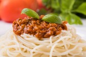 Spaghetti na widelcu. Makaron z świeżych pomidorów i klopsiki