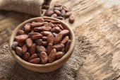 Kobieta ręce aromatyczne ziarna kakaowego w gospodarstwie