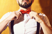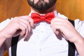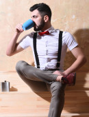 Człowiek z brodą, biały hipster z wąsami i butelką perfum