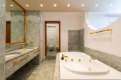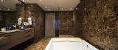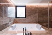 Zdjęcie "Nowoczesna łazienka z marmuru i parkiet, nikt nie" może być wykorzystywane do celów osobistych i komercyjnych zgodnie z warunkami zakupionej licencji Royalty-free. Obraz jest dostępny do pobrania w jakości wysokiej rozdzielczości do 5760x3840.