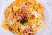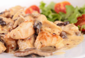 Stroganow cielęcina z pieczarkami, podajemy z sosem i puree z ziemniaków z serem