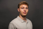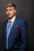 Człowiek w polo szary t-shirt na czarnym tle z uśmiechem