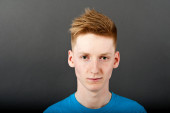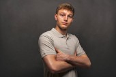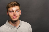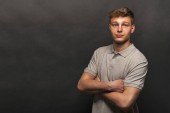 Człowiek w polo szary t-shirt na czarnym tle z uśmiechem
