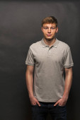 Człowiek w polo szary t-shirt na czarnym tle z uśmiechem