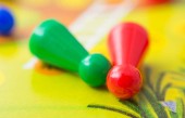 Zbliżenie szary Wiertarka z małe niebieskie i żółte drewniane kawałki na zielonym tle