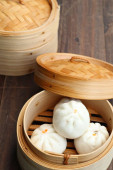 closeup of steamed buns bamboo steamer - dim sum