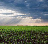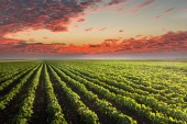 Łąka upraw soi młodych o zachodzie słońca sielankowy