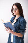 Piękna dziewczyna w piżamie, czytanie książki w pomieszczeniu