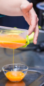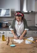 Kobieta, włamanie się do stałego mąki jajko w kuchni