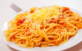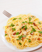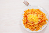 Spaghetti z sosem rybnym. Widok z góry. na białym tle
