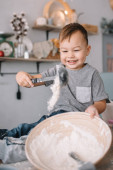 mały chłopiec bawi się z mąki