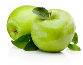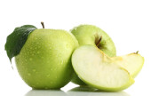 dojrzałe jabłka zielone z liści i kromka na białym tle