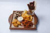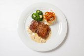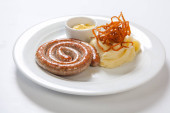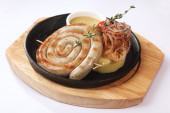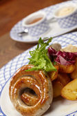 Puree i pieczona kiełbasa lub kiełbasy na białym talerzu